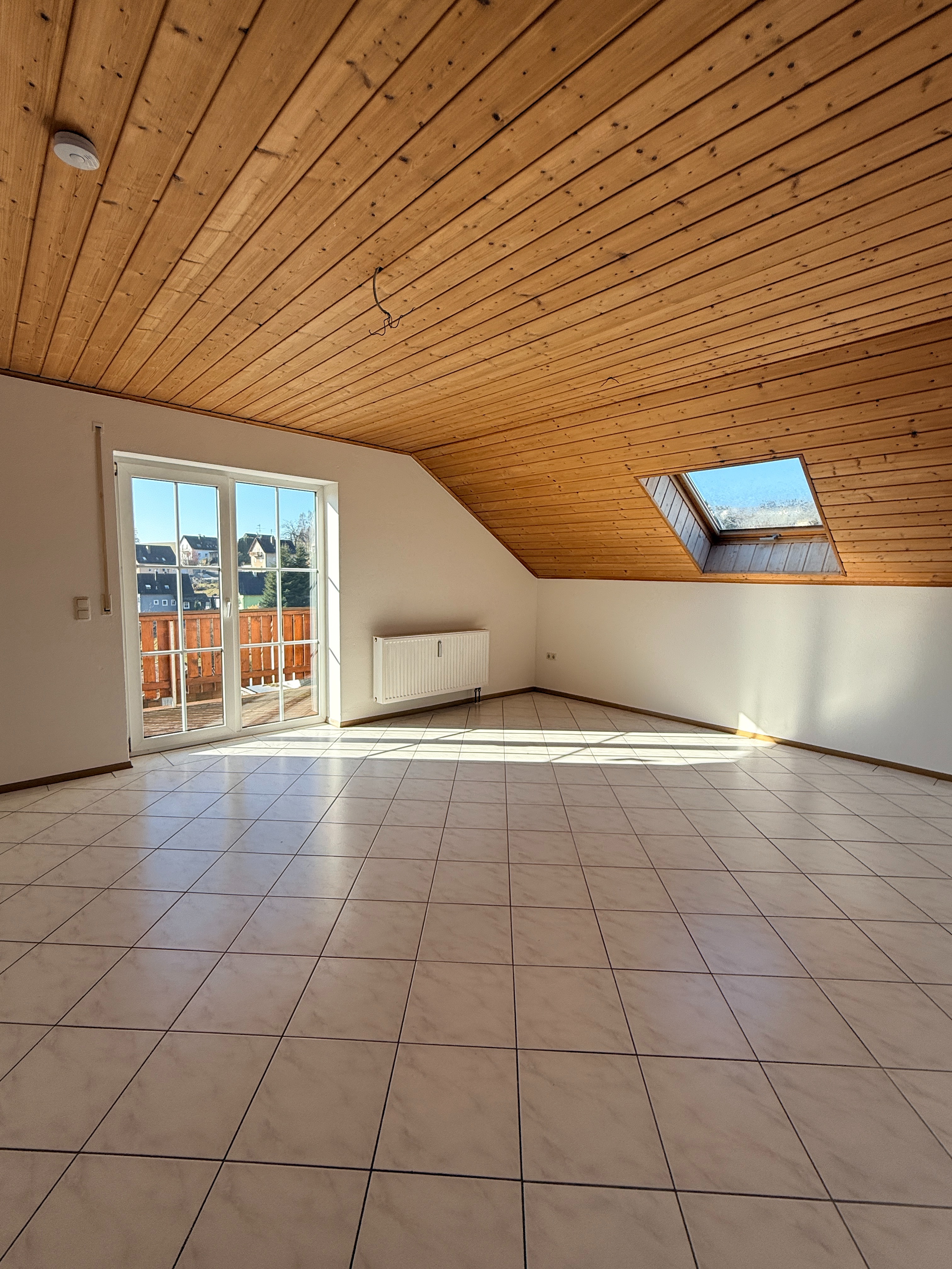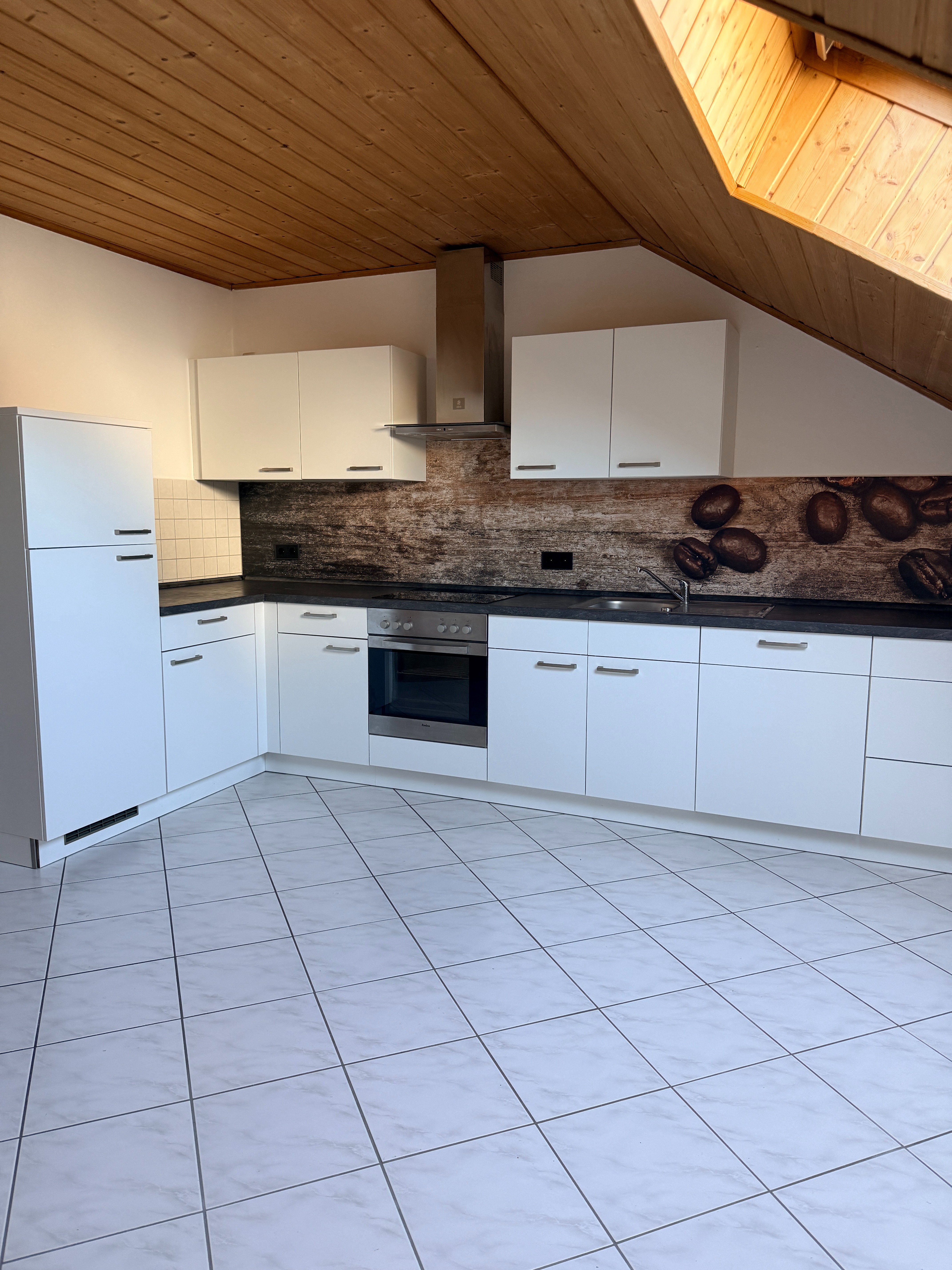 Bereits beim Betreten der Wohnung entsteht durch die warmen Holzdecken und die hellen Bodenbeläge ein gemütliches Wohngefühl. Der großzügige Wohnbereich bildet das Herzstück der Wohnung und bietet direkten Zugang zum sonnigen Balkon mit Blick in die grüne Umgebung – ein idealer Ort zum Entspannen.