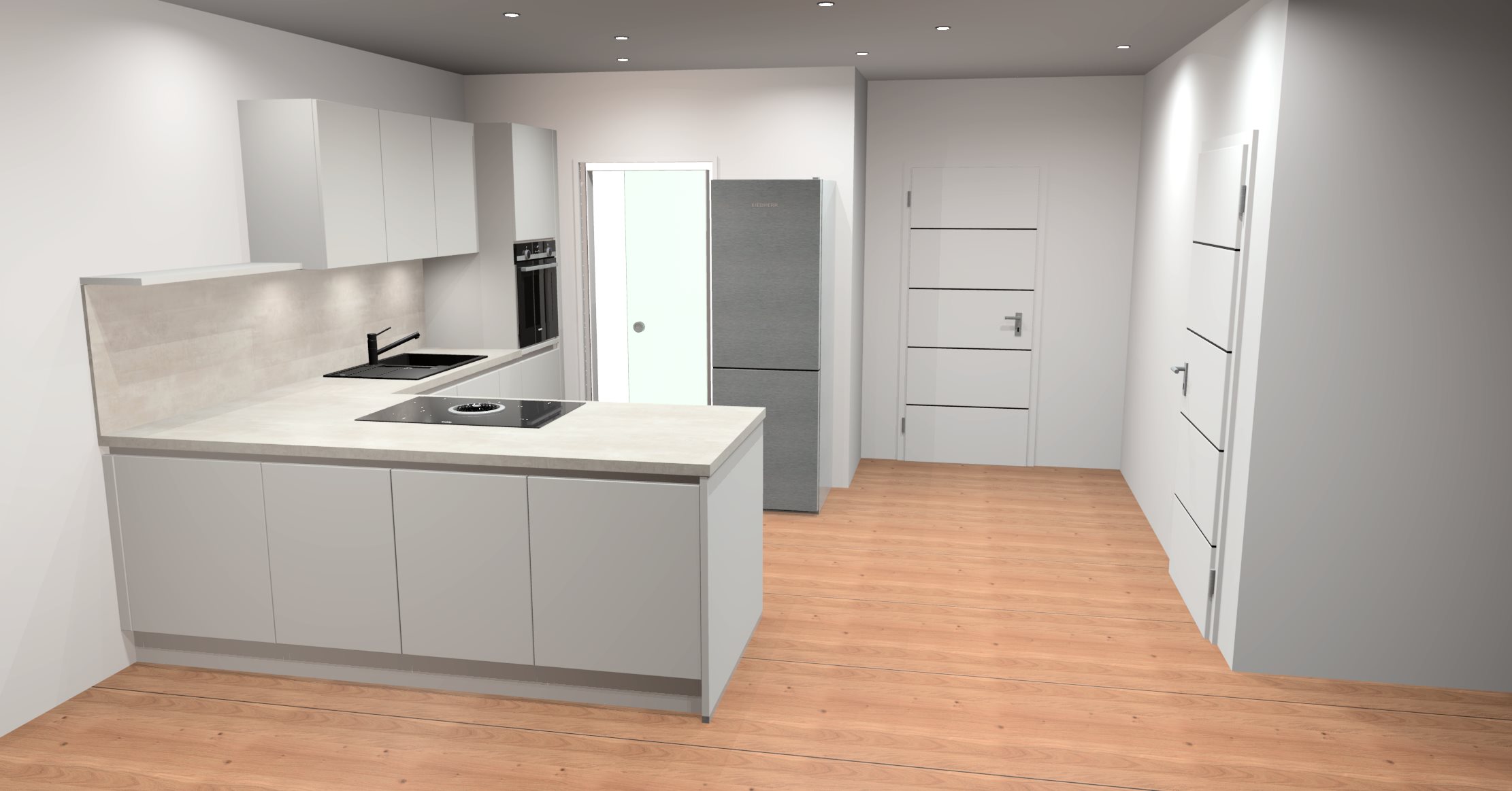 Der weitläufige Wohn- und Essbereich mit integrierter Küche bildet das Herzstück der unteren Ebene. Durch die große Fensterfront öffnet sich der Raum direkt zur Terrasse und in den Garten – ein idealer Bereich für Erholung und gesellige Momente. Ergänzend befinden sich hier eine Speisekammer, ein Gäste-WC, ein Abstellraum sowie ein funktionaler Hauswirtschaftsraum.