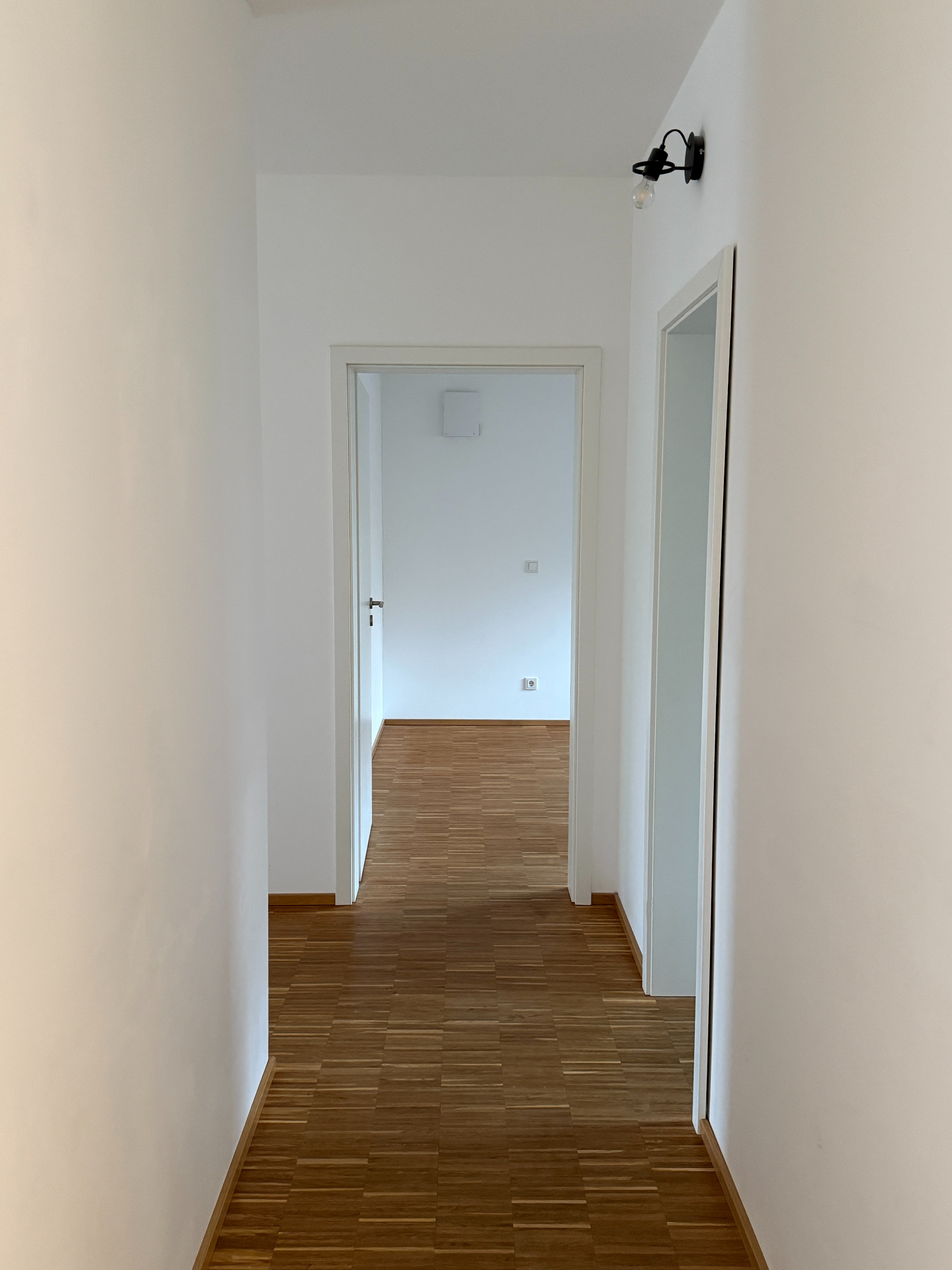 Wohnraum: Zwei komfortable Schlafzimmer, ein modernes Badezimmer, ein Gäste-WC sowie ein helles Wohnzimmer mit offener Küche. Hinweis: Die Wohnung wird ohne Einbauküche vermietet.
